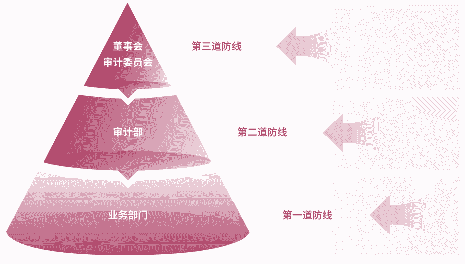 为有效防范贿赂与贪污等商业道德风险,,,,公司建立了由“董事会审计委员会、、、、审计部、、、、业务部门”组成的三道防线,,全面落实公司商业道德合规工作,,,并确保《商业道德行为准则》的有效执行。。。。公司审计部在董事会审计委员会的指导下定期评估、、、、审查公司的合规运营情况及准则的履行情况,,,并对公司及所有子公司开展商业道德行为审计。。公司保证商业道德行为准则审计工作每三年覆盖公司及其所有控股子公司的全部业务范围。。