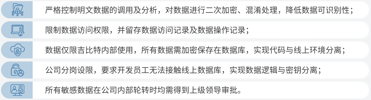 公司对用户个人信息实施脱敏处理,,严格限制用户信息用途,,,数据使用完成后集中归档处理。。为进一步确保数据处理过程的安全,,,,公司根据实际的业务工作分岗设限,,,最大程度保护数据隐私安全,,如在生产网络中的加密数据由研发部门员工负责编写加、、解密程序,,但其无法直接访问到加密后的数据库;程序的加、、、、解密密钥由运维员工单独配置。。。