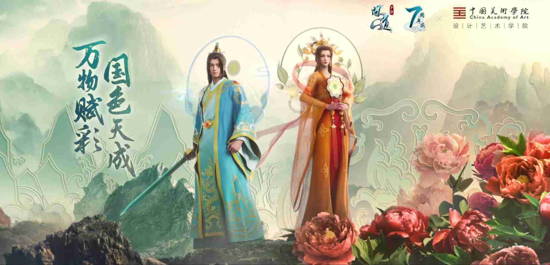 2023年4月,,,《问道手游》联动中国美术学院,,,,在游戏中融合了中国历史上不同时期的文化元素,,打造了“山河万象”与“凤鸣九霄”的国风时装。。。。在色彩配置方面,,,创作团队基于对游戏角色特性的分析提取相应的文化内涵,,,,从每一种色彩的色相、、、指代事物和情感出发对应角色属性,,选定服装的色彩搭配。。。在纹样设计方面,,,创作团队结合游戏角色自身特殊的造型比例和形态,,,在实际的纹样设计中进行了游戏语境下的活化演绎。。男性角色集中使用了如蟒纹、、、海水江崖纹、、、、如意纹和云气纹等传统纹样元素,,,,女性角色则吸纳了凤凰纹、、牡丹纹、、、卷草缠枝纹等元素,,,,组成以“双凤牡丹纹样”“缠枝牡丹纹”“金玉凤冠头饰”为主要纹样的游戏角色装饰图案系统。。。