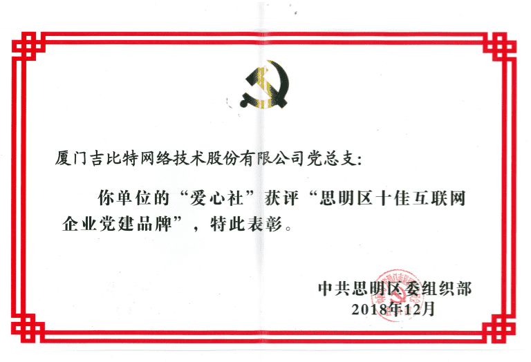 经初审评选、、、网络评选和专家评审等环节,,"厦门yaxin111网络技术股份有限公司党总支-爱心社" 从全区28个参评党建品牌中脱颖而出,,,获评"思明区十佳互联网企业党建品牌"。。
